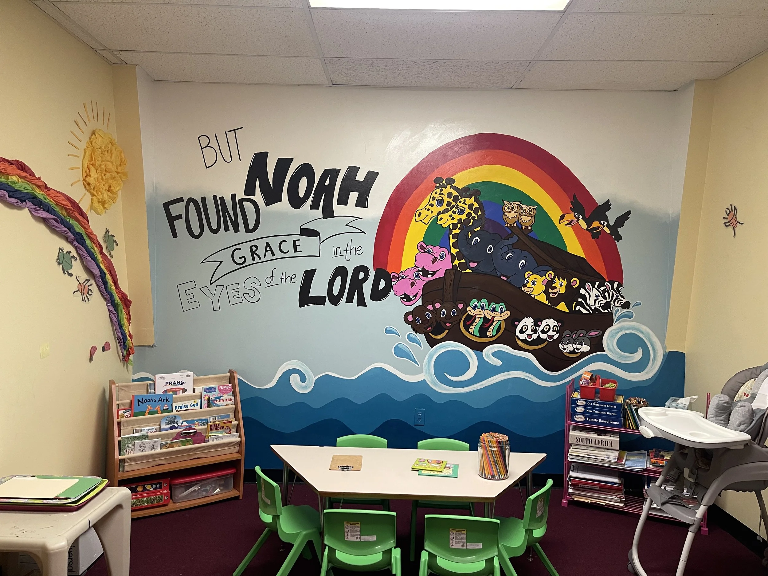 This mural was created for a children’s nursery and brings the story of Noah’s Ark to life through bold, bright color and playful imagery. Rooted in a message of God’s care, protection, and promise, the artwork introduces young children to a beloved biblical story in a joyful and approachable way.